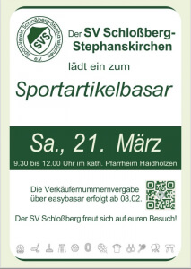 Der Frühling steht vor der Tür – und damit auch unser beliebter Sportartikelbasar! Am Samstag, den 21. März 2026, lädt der SV Schloßberg-Stephanskirchen herzlich ins katholische Pfarrheim Haidholzen ein.